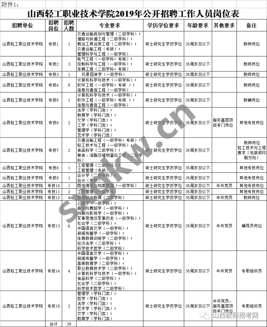 山西輕工職業技術學院2019年公開招聘工作人員36名,招聘崗位所需的具體條件以《山西輕工職業技術學院2019年公開招聘工作人員崗位表》(以下簡稱《崗位表》)的要求為準。