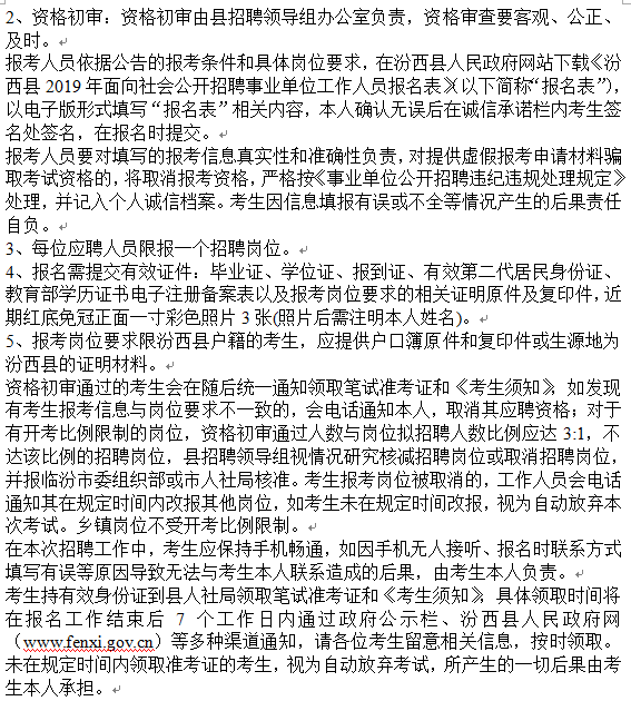 (五)具備報考崗位所需的其它條件(詳見《汾西縣2019年面向社會公開招聘事業單位工作人員崗位一覽表》)。